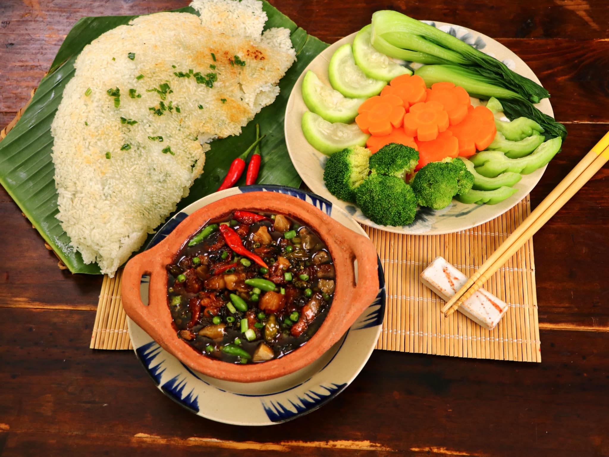 Cơm cháy kho quẹt lại là món ăn gợi nhắc rõ nhất về bữa cơm quê miền Tây. Kho quẹt sánh mịn, mặn mà từ nước mắm, tóp mỡ, tiêu và ớt, được dùng kèm cơm cháy giòn rụm và rau luộc như đậu bắp, bông súng, cải xanh.