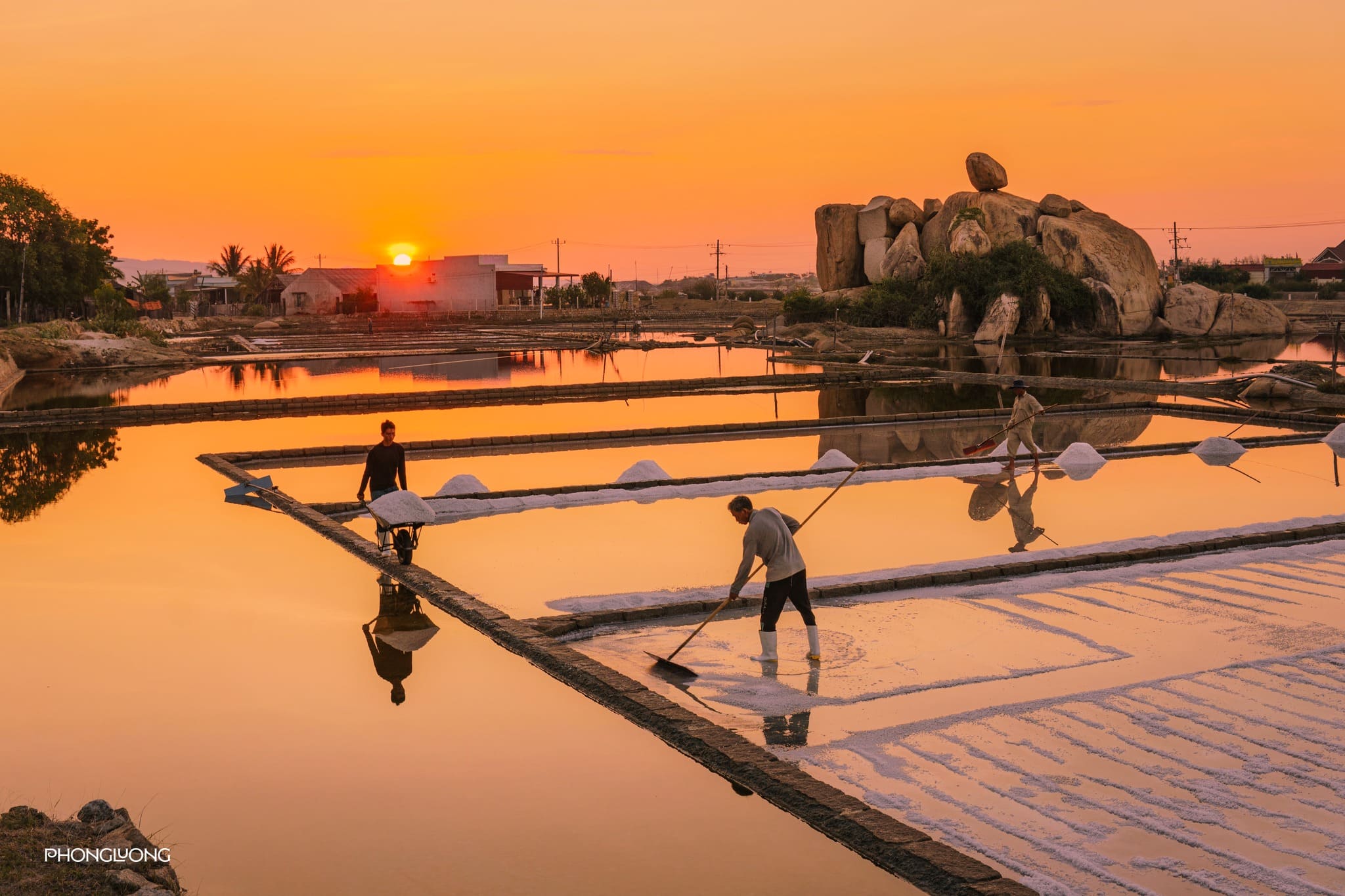 Giữa không gian vàng óng của bình minh, những người diêm dân Khánh Tường (Khánh Hòa) âm thầm làm nên những hạt muối trắng tinh khôi – kết tinh của biển cả, nắng gió và mồ hôi lao động.