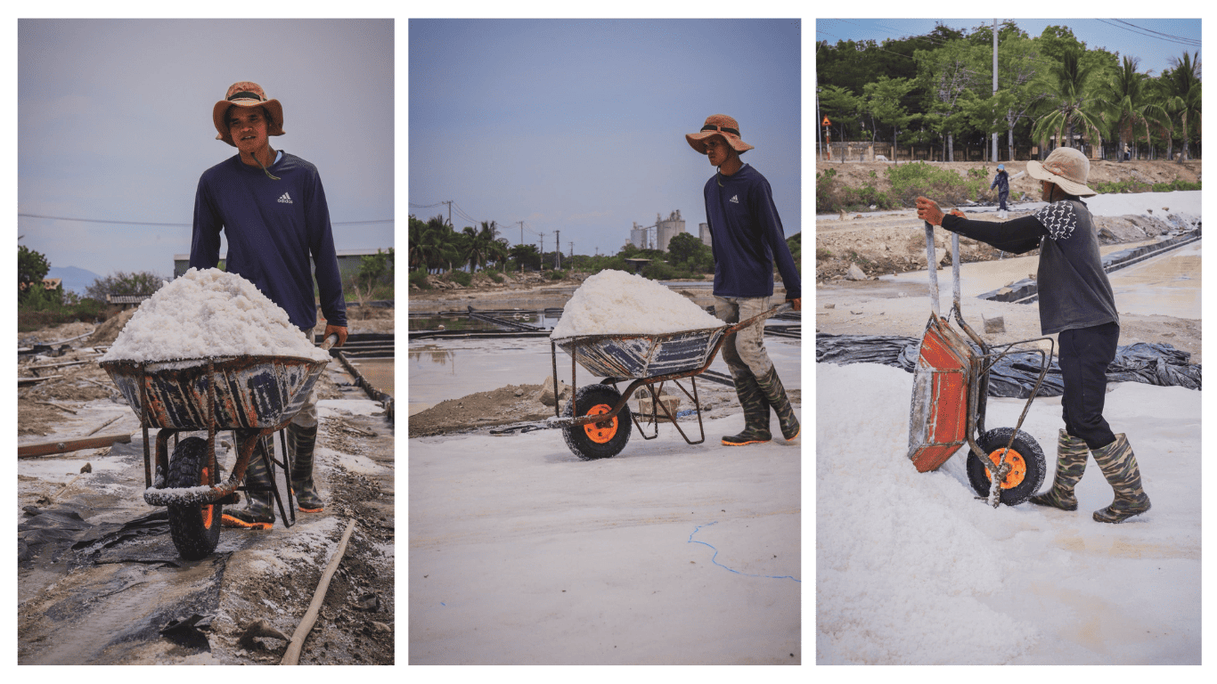 Tôi đứng nhìn người dân nơi đây – những con người gắn bó cả đời với nghề làm muối – cần mẫn thu hoạch muối từ sớm tinh mơ. Từng gánh muối nặng oằn vai, từng nhịp bước chậm rãi trên mặt ruộng là bao nhọc nhằn, là sự kiên nhẫn và cả một niềm tự hào lặng lẽ về nghề truyền thống của quê hương. Không vội vã, không màu mè, chỉ có sự tận tụy và tình yêu âm thầm dành cho mảnh đất đã nuôi sống biết bao thế hệ.
