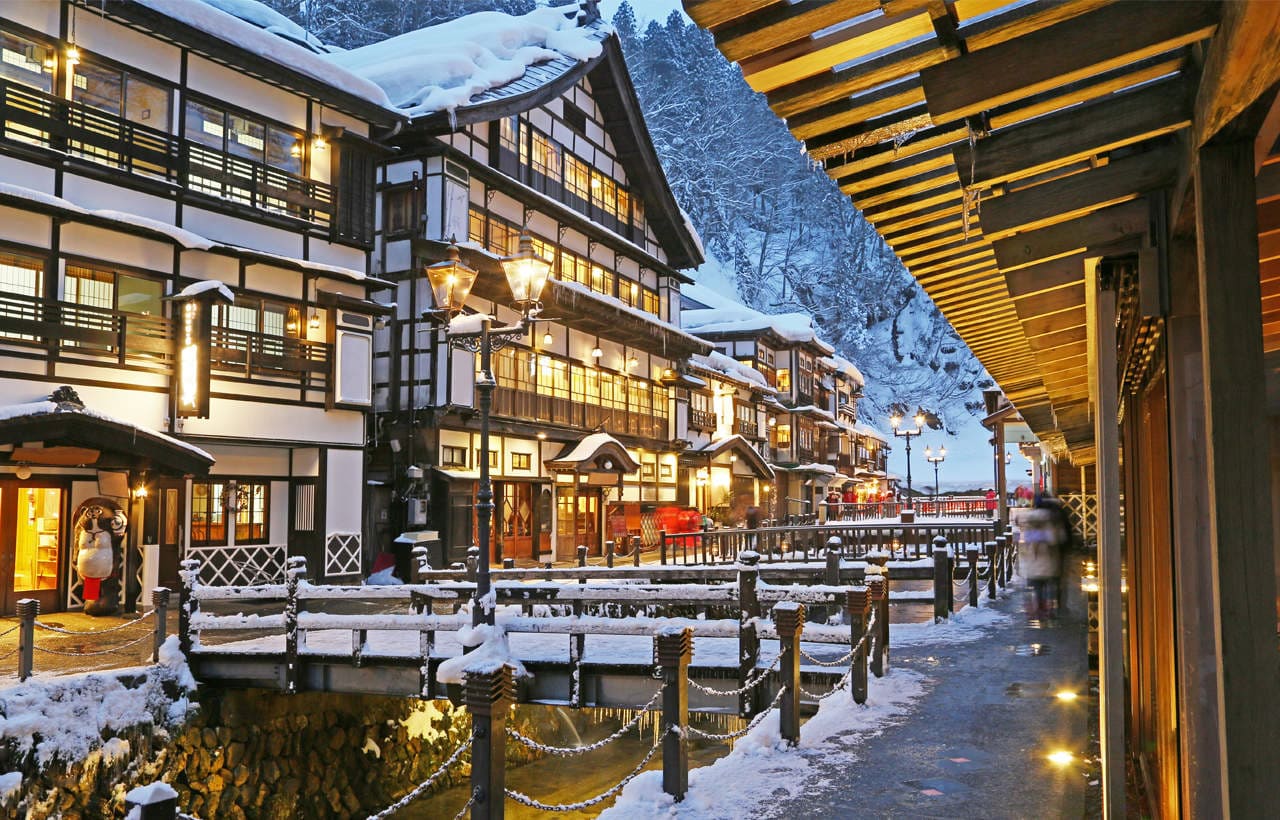 Ginzan Onsen được ví như bước ra từ truyện cổ tích mùa đông Nhật Bản. Ngôi làng onsen nhỏ thuộc tỉnh Yamagata nổi bật với những ryokan bằng gỗ cổ kính, con suối nhỏ chảy giữa làng và những chiếc đèn vàng lung linh phản chiếu trên nền tuyết trắng.