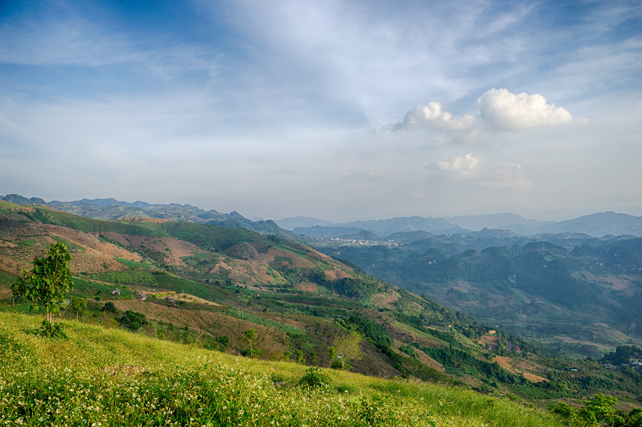 Trên đường từ Hang Táu về, khung cảnh mê mẩn thế này đây. Mặt trời lúc đấy đang muốn chim xuống chân trời, thả ra một thứ ánh sáng cực kỳ hư ảo lên trùng trùng núi non. Cảm nhận hùng vĩ vô cùng mà như với tay ra là chạm vào được vậy.