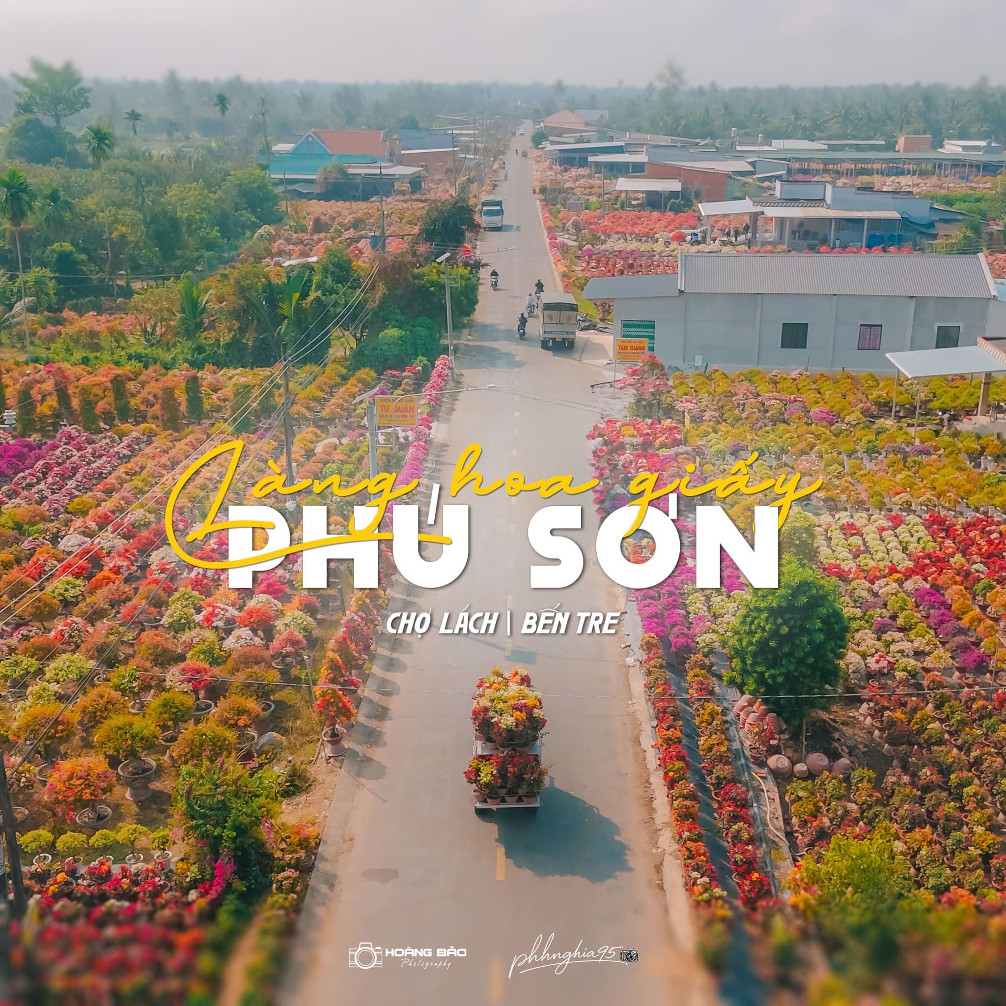 Làng hoa giấy Phú Sơn với những hàng hoa giấy rực rỡ, đa sắc bung nở tự nhiên dọc lối đi, trước hiên nhà. Một thiên đường hoa giấy tại huyện Chợ Lách, Bến Tre cũ...