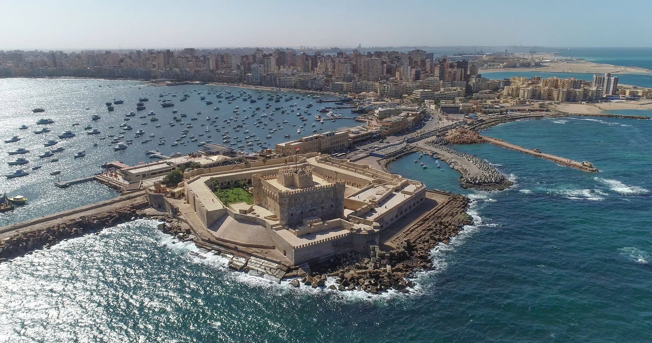 - Pháo đài Qaitbay: Được xây dựng bởi vị vua Hồi giáo Sultan Qaitbay vào năm 1480 theo phong cách trung cổ, nằm ngay trên nền cũ của ngọn hải đăng Pharos - vốn đã bị phá hủy bởi một trận động đất vào khoảng năm 1100.
